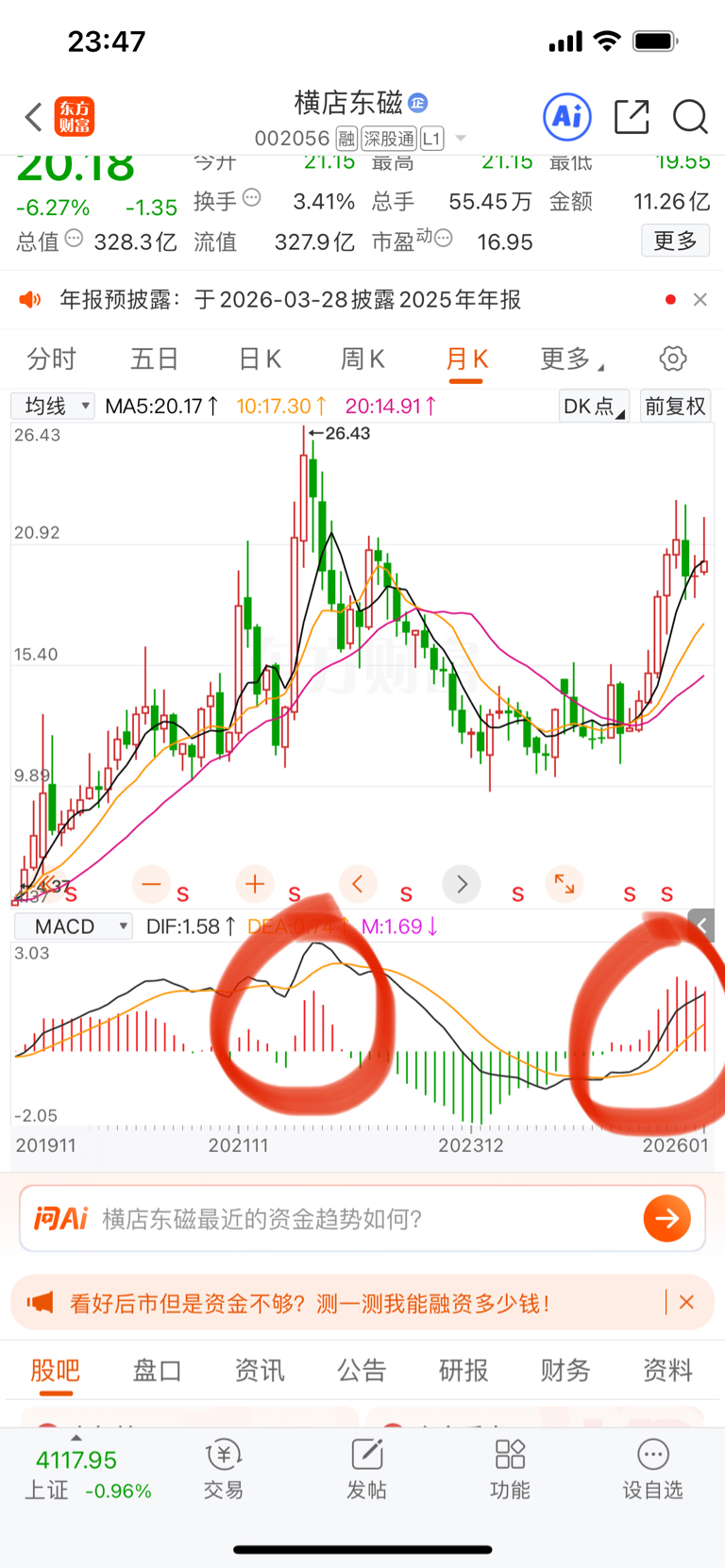 $横店东磁(SZ002056)$ 股价未新高macd红柱高,月线级别还是能看的。短期光伏领涨龙头拓日塞伍双双跌停,主力跑差不多了。金银退潮导致顺周期全面哑火,传导到有小金属属性的稀土永磁板块,而且周五的量不小,割肉的不少,但是补仓的更多,周线反包的概率很小