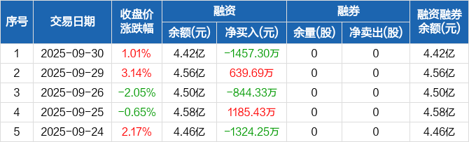 中钢天源:融资净偿还1457.3万元,融资余额4.42亿元(09-30)