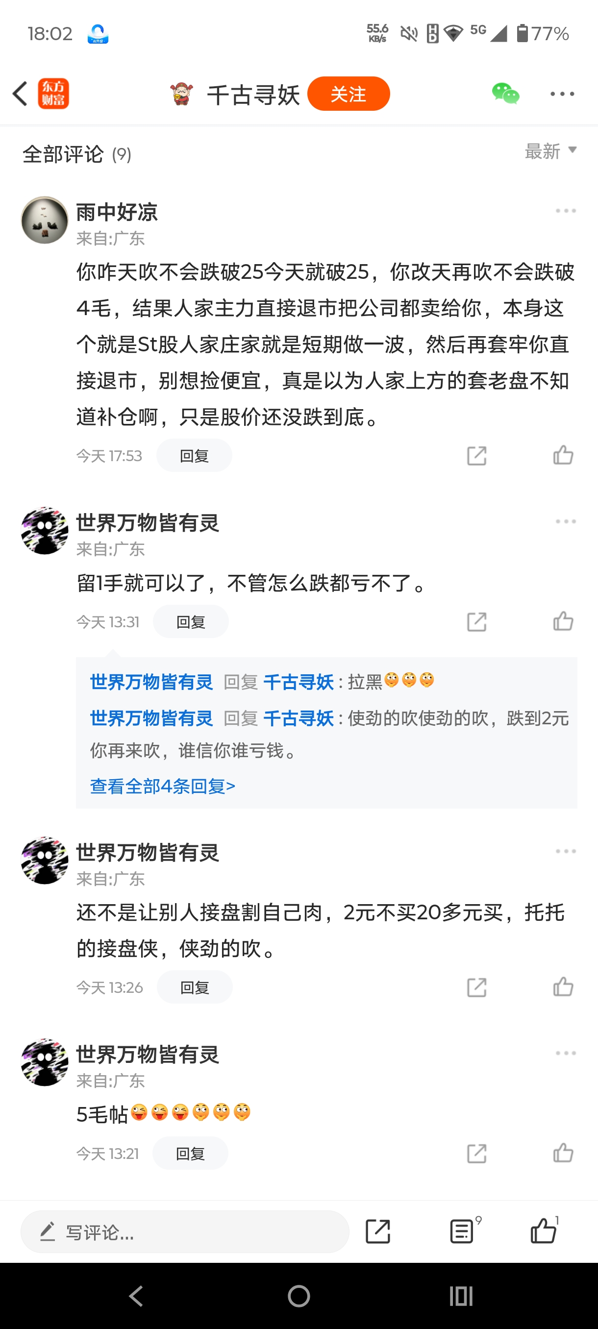 最近股吧里来了个吹神叫千古寻妖,是主力小弟来帮主力顺力出货己有多人上当损失惨重,