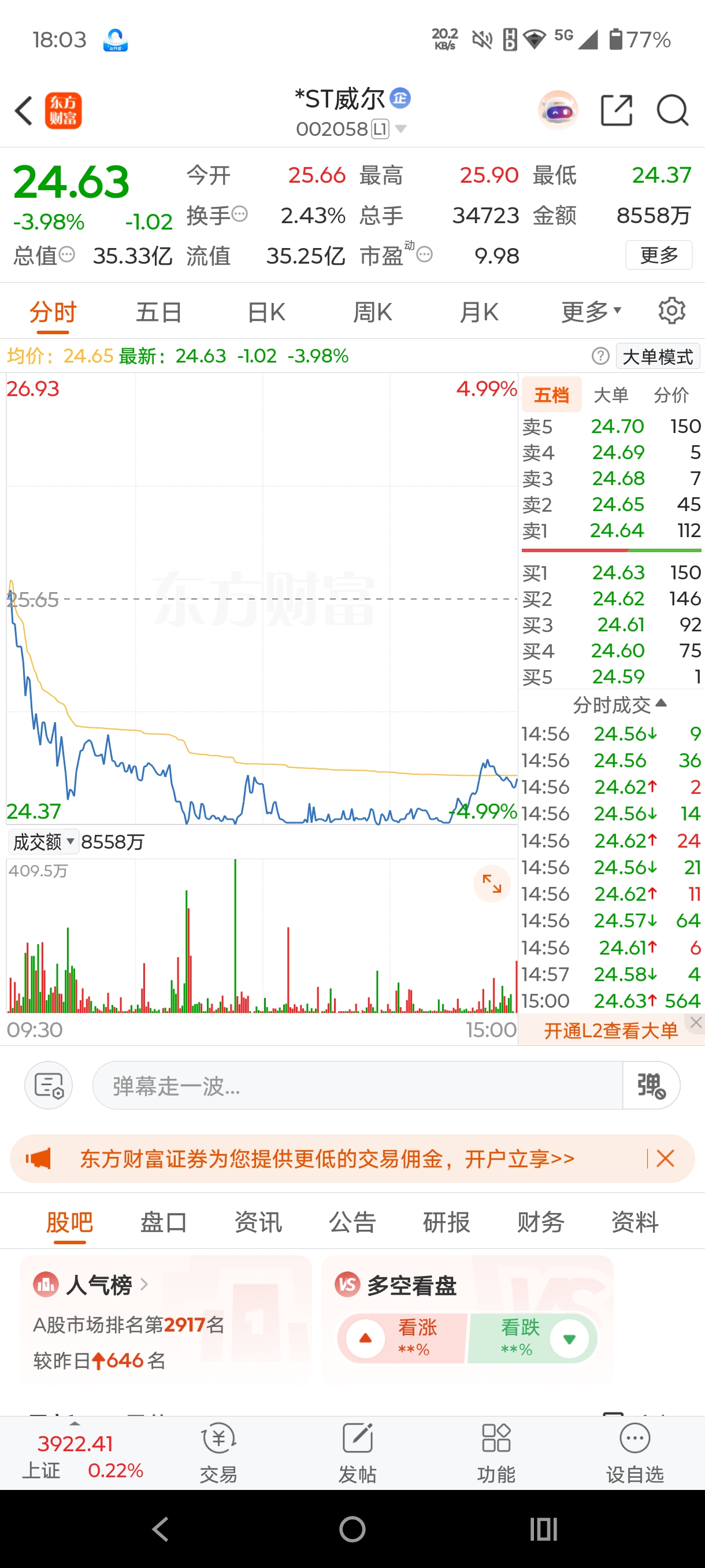 $*ST威尔(SZ002058)$ $*ST威尔(SZ002058)$最近股吧里来了个吹神叫千古寻妖,是主力小弟来帮主力顺力出货己有多人上当损失惨重,等主力出完了货又玩消失,几十个跌停板直接退市钱就打水了,