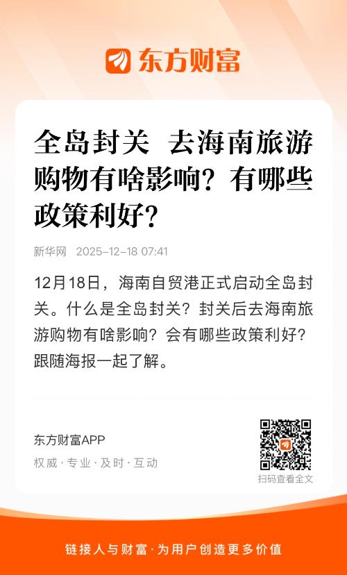 12月18日,海南自贸港正式启动全岛封关。什么是全岛封关?封关后去海南旅游购物有啥影响?会有哪些政策利好?跟随海报一起了解。