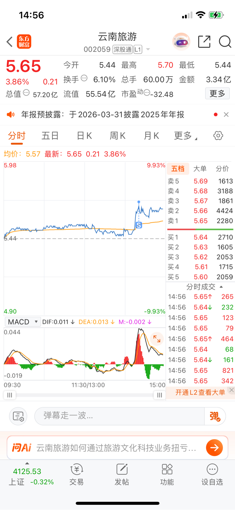 $云南旅游(SZ002059)$ 挂了一天的条件单5.7卖出,主力没有吃完,明天回踩五日线