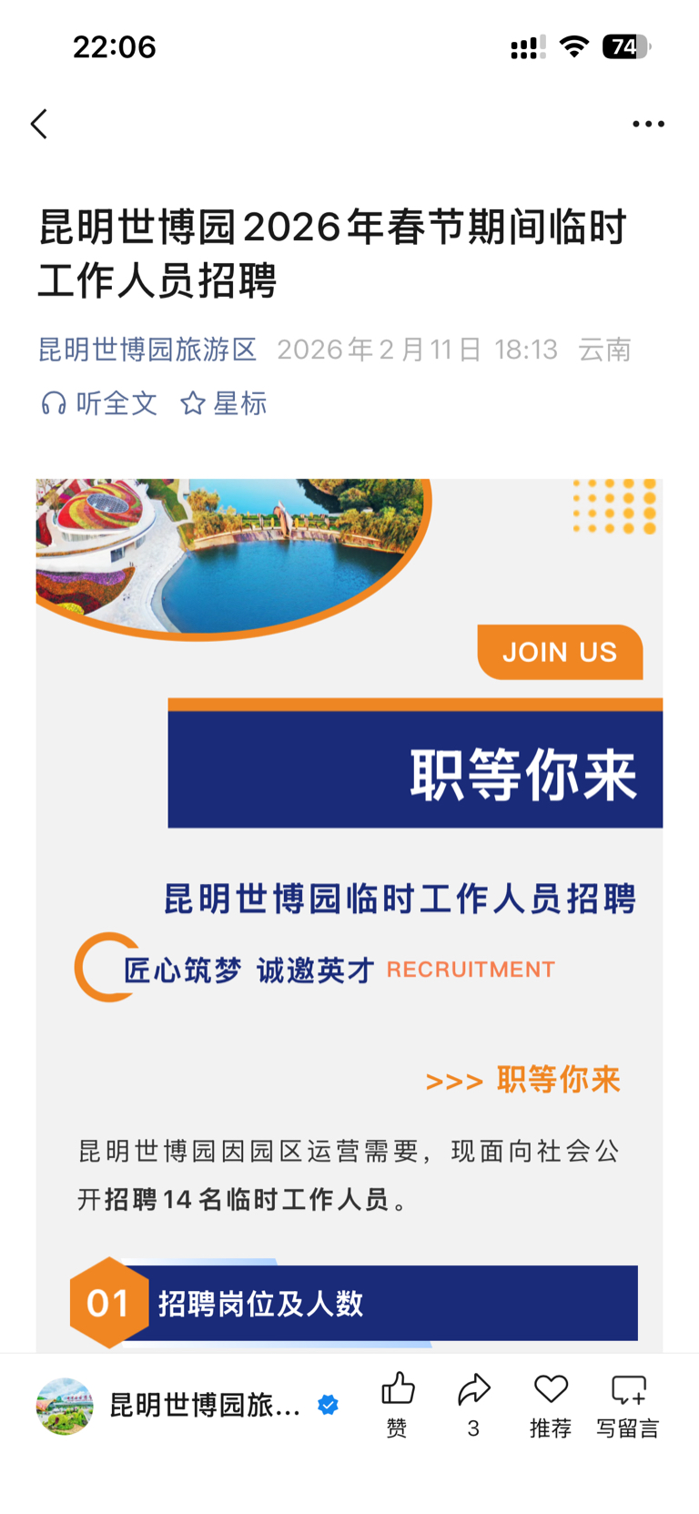 $云南旅游(SZ002059)$ 你们自己看,景区肯定火爆,发布过年招人公告了,往年根本不招人,今年春节假期肯定爆满