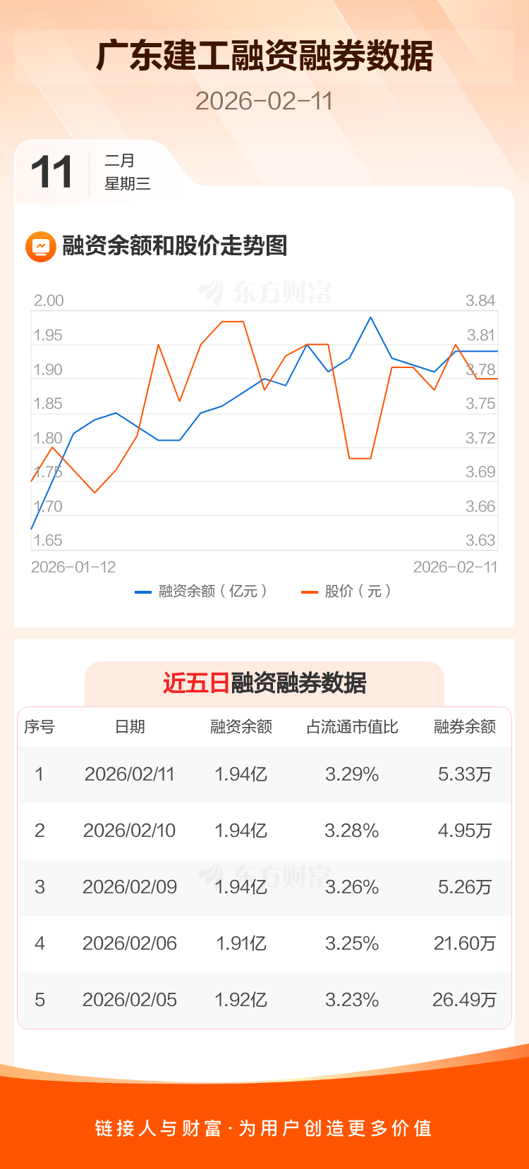 交易所最新数据显示,广东建工于2026年2月11日获融资买入586.77万元,融资偿还533.36万元,当日融资净买入53.41万元。目前,该股融资余额1.94亿,占流通市值比例为3.29%。