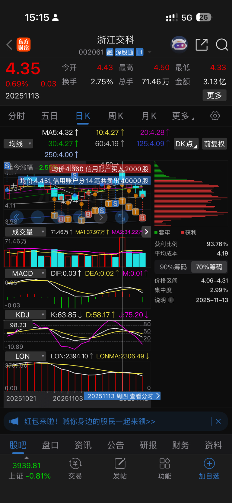 $浙江交科(SZ002061)$ 幸亏4.45卖岀一半,成本4以下了