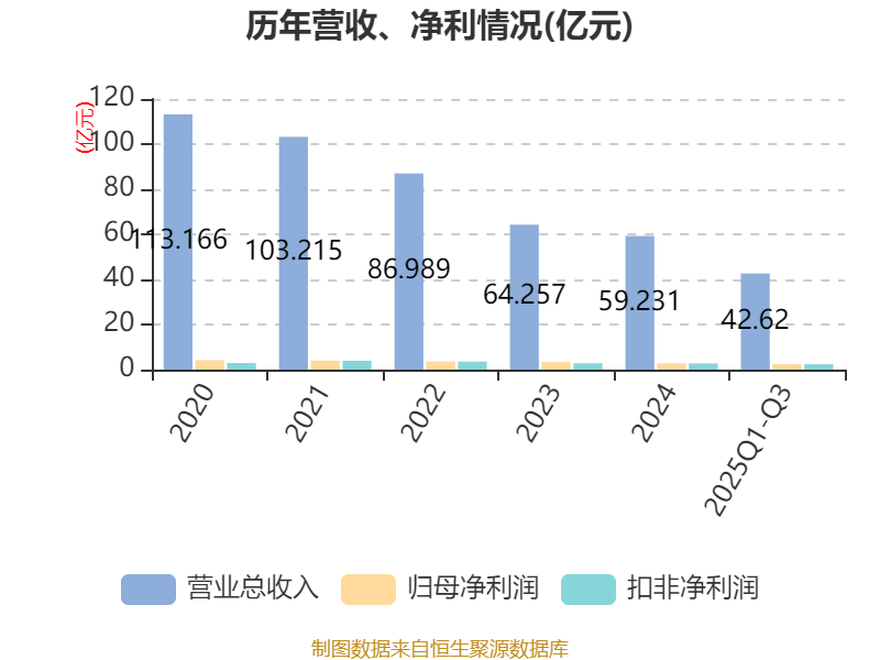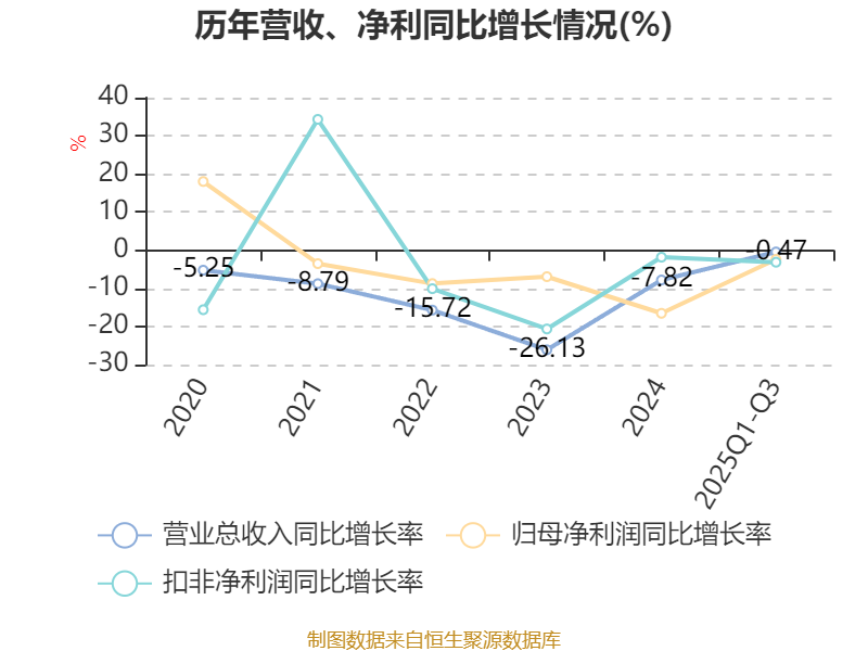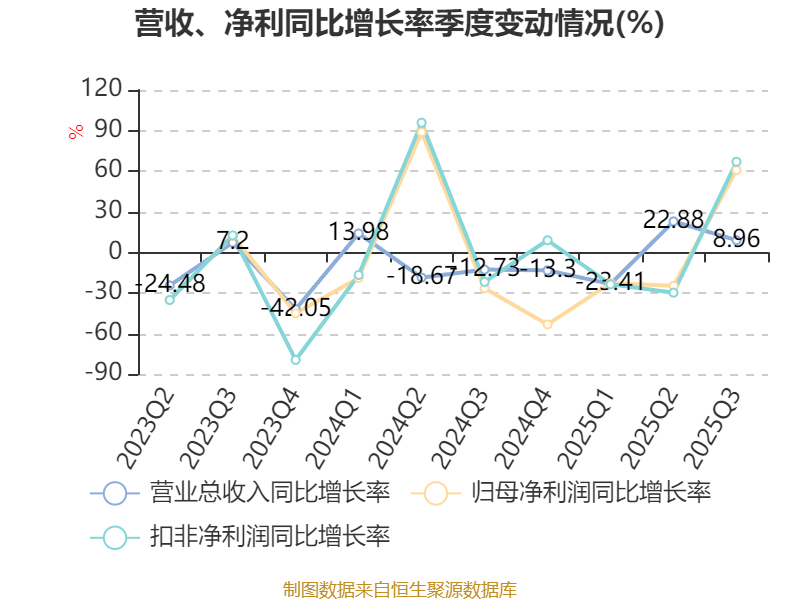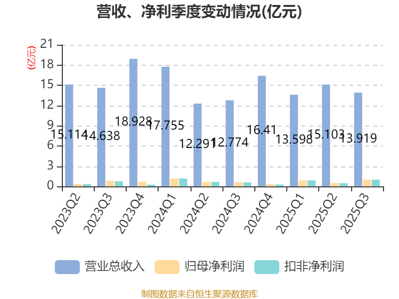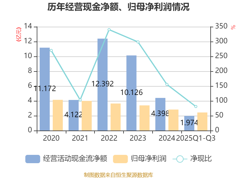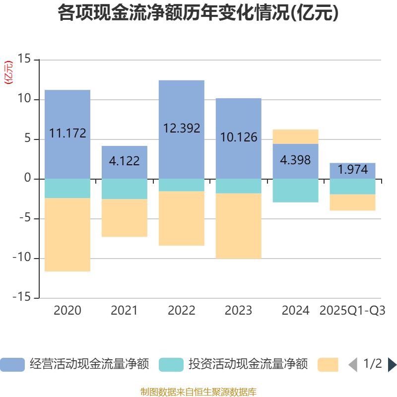 2025年前三季度,公司经营活动现金流净额为1.97亿元,同比增加2.51亿元;筹资活动现金流净额-2.04亿元,同比减少1.59亿元;投资活动现金流净额-1.99亿元,上年同期为-1.79亿元。