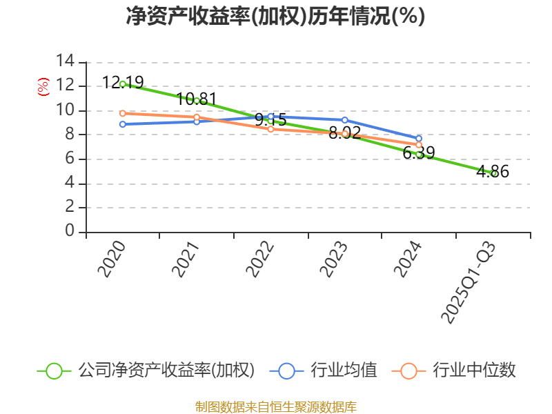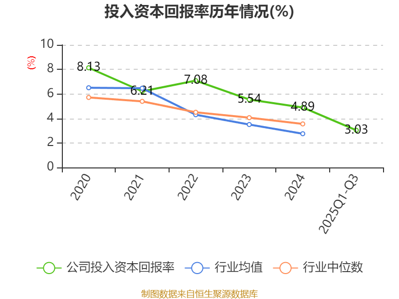 盈利能力方面, 2025年前三季度公司加权平均净资产收益率为4.86%,同比下降1.19个百分点。公司2025年前三季度投入资本回报率为3.03%,较上年同期下降1.91个百分点。