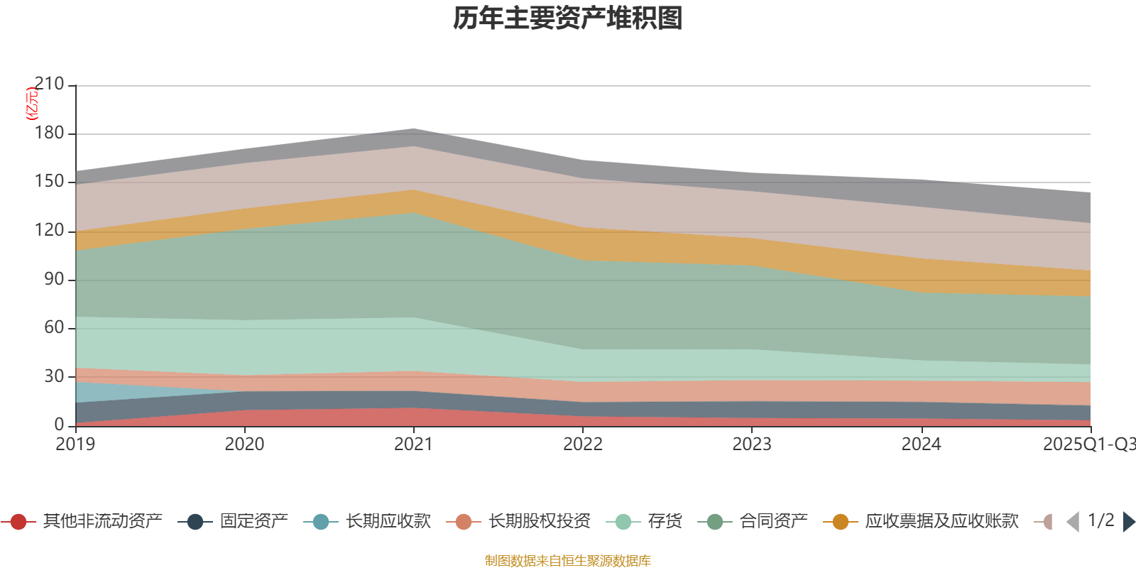资产重大变化方面,截至2025年三季度末,公司应收票据及应收账款较上年末减少24.48%,占公司总资产比重下降2.82个百分点;合同资产较上年末增加0.02%,占公司总资产比重上升1.54个百分点;长期股权投资较上年末增加9.72%,占公司总资产比重上升1.37个百分点;在建工程合计较上年末增加40.08%,占公司总资产比重上升0.93个百分点。