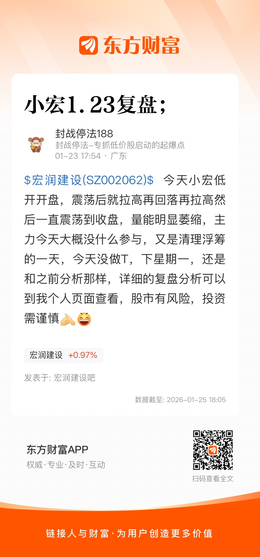 $宏润建设(SZ002062)$ 今天小宏低开开盘,震荡后就拉高再回落再拉高然后一直震荡到收盘,量能明显萎缩,主力今天大概没什么参与,又是清理浮筹的一天,今天没做T,下星期一,还是和之前分析那样,详细的复盘分析可以到我个人页面查看,股市有风险,投资需谨慎