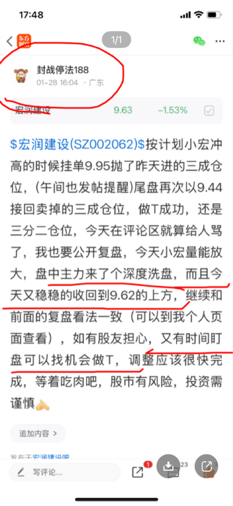 我给那些只看到我发一篇盘中小唠叨就骂我的人骂怕了,盘后不再复盘,如果有关注我的股友就会清楚知道我对于小宏的操作计划,我的操作计划就是做T,今天早盘我同样发帖说小宏高开,要注意盘面,我说的不要卖飞,他们又不懂,不要卖飞有看我每天复盘的股友就知道,是指不要把底仓卖掉(通过底仓去做T,每天写复盘,分析对了,没什么,错一点点就给人骂),股市有风险,投资需谨慎