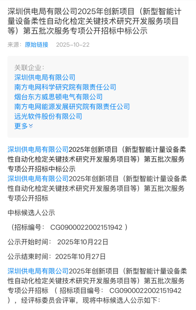 深圳供电局有限公司2025年创新项目(新型智能计量设备柔性自动化检定关键技术研究开发服务项目等)第五批次服务专项公开招标中标公示【远光软件】