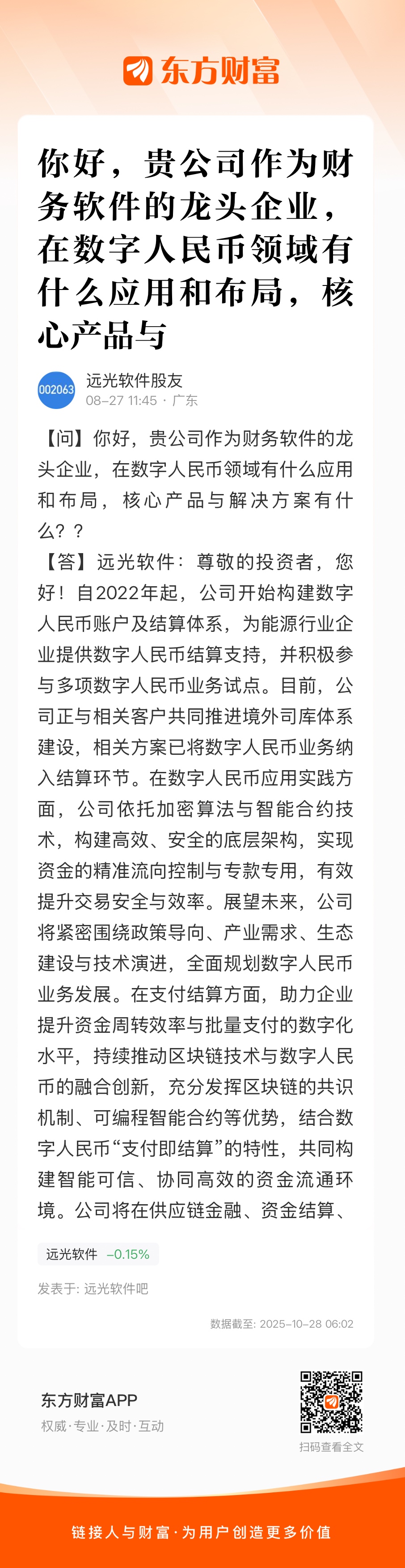 #强势机会# 在数字人民币应用实践方面,公司依托加密算法与智能合约技术,构建高效、安全的底层架构,实现资金的精准流向控制与专款专用,有效提升交易安全与效率。