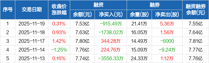 融资方面,当日融资买入5198.28万元,融资偿还6113.77万元,融资净偿还915.49万元。融券方面,融券卖出6.07万股,融券偿还7100股,融券余量21.41万股,融券余额139.41万元。融资融券余额合计7.55亿元。