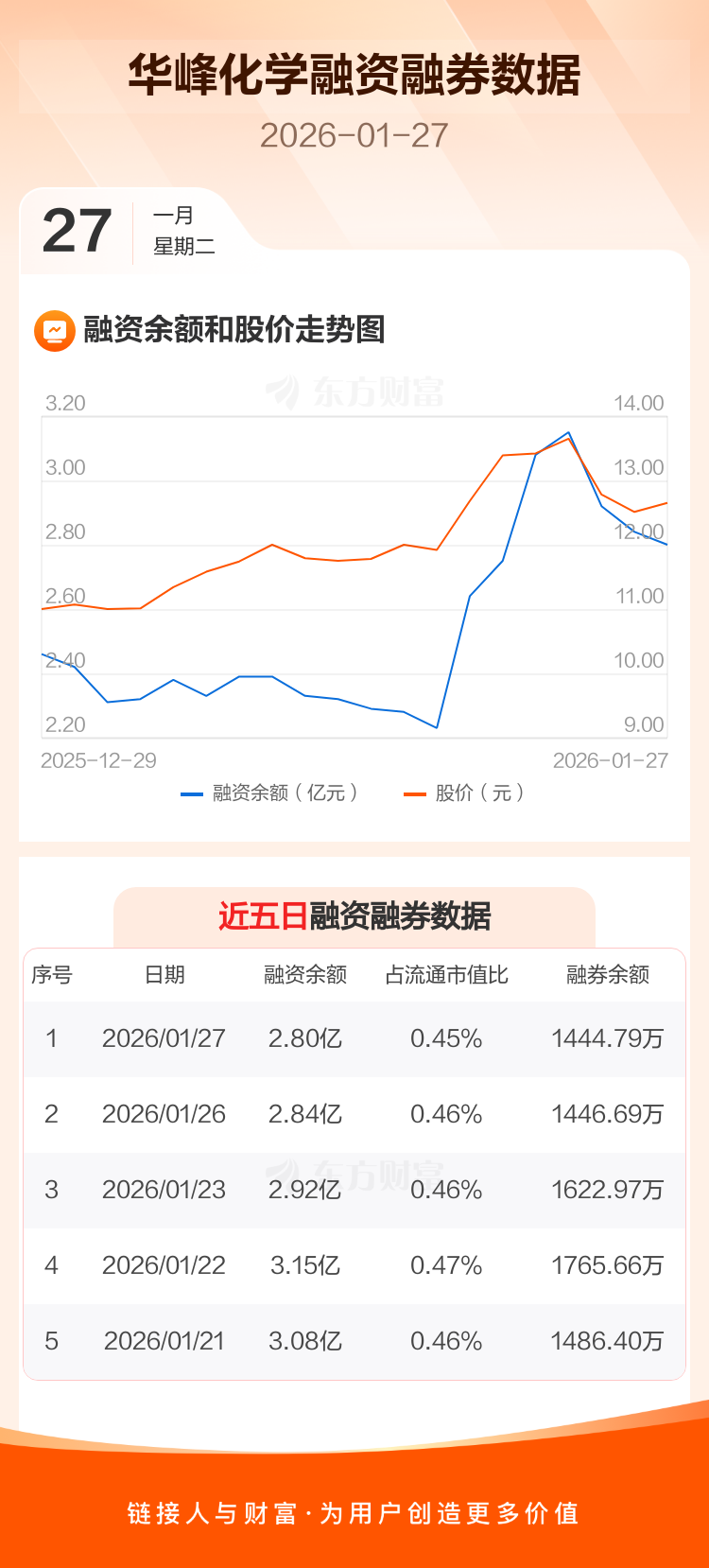 交易所最新数据显示,华峰化学于2026年1月27日获融资买入4101.75万元,融资偿还4546.72万元,当日融资净偿还444.98万元。目前,该股融资余额2.80亿,占流通市值比例为0.45%。