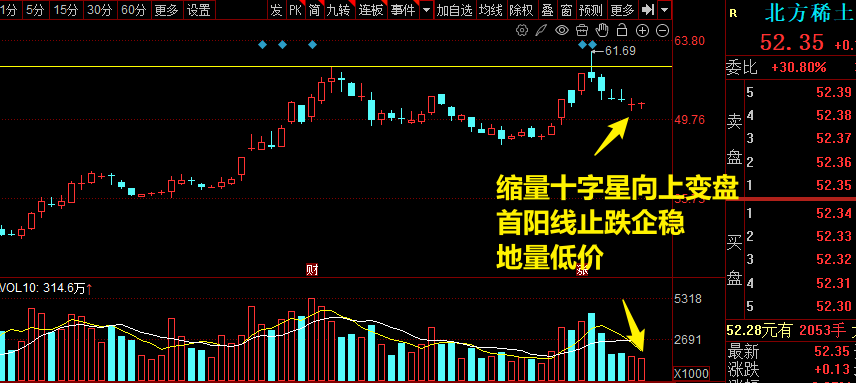 我之前一直强调稀土作为反制的主线,调整下来就是机会,前面连续调整了5天时间,今天早盘跌下来的时候小苍位进了,为什么我再这里出手了呢?大家再看下昨天的K线是一个缩量十字星,明显变盘信号,今天全天是震荡向上走高,收出一个缩量小阳线,明显的止跌信号,短期至少向下跌的空间不大,具备了足够多的安全垫,只要关税问题还在反复,那么稀土板块永远不缺机会!
