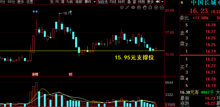 之前我一直和大家说,长城在缩量洗盘,已经回踩15.95跌不动了,今天早盘出现了放量拉升,我在留言区也提示了大加,今天的放量大阳线,就是一个反转的信号,回踩15.95支撑位不破,下方是有支撑,有主俚护盘的,目前这个位置上车,下方有安全垫,上方空间很大,如果还没在车上的,明天早盘可以关注下是否有合适的上车机会。