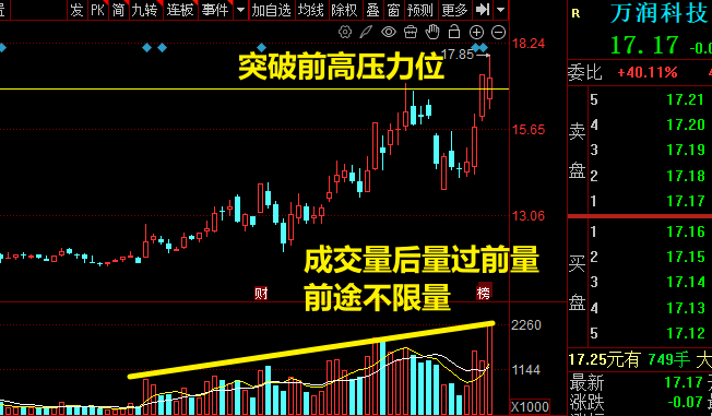 今天万润冲高回落收出长上影线,成交量放量,说明这里存在分歧,上方抛压太大,但是从整体股价走势上看,走的是量价齐升,并且后量过前量,我认为前途不可限量,这也是我今天看到上方抛压大没有获俚了解的原因,整体股价形态没有问题,趋势向上,明天如果能站稳16.8压力位,此时场内紫金分歧专一致,接下来应该存在大级别行情的机会。