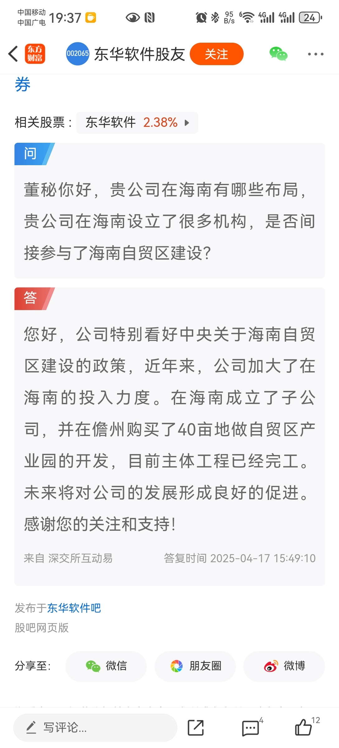 $东华软件(SZ002065)$ 您好,公司特别看好中央关于海南自贸区建设的政策,近年来,公司加大了在海南的投入力度。在海南成立了子公司,并在儋州购买了40亩地做自贸区产业园的开发,目前主体工程已经完工。未来将对公司的发展形成良好的促进。感谢您的关注和支持!