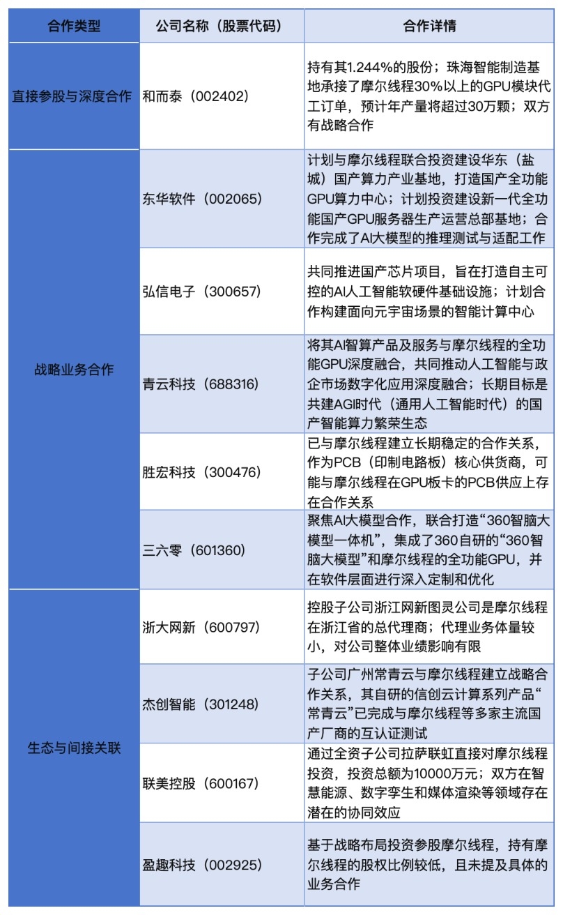 摩尔线程作为国产GPU龙头企业,其概念股主要围绕股权投资、供应链合作及算力生态协