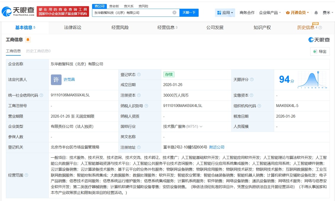 东华软件在北京丰台成立数智科技公司