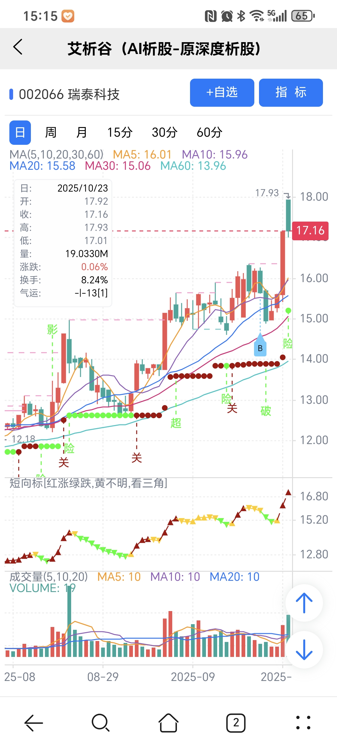 红绿小圆点是艾析谷的量化指标-超级短趋线,是趋势跟踪+突破类的量化指标,完全免费。
