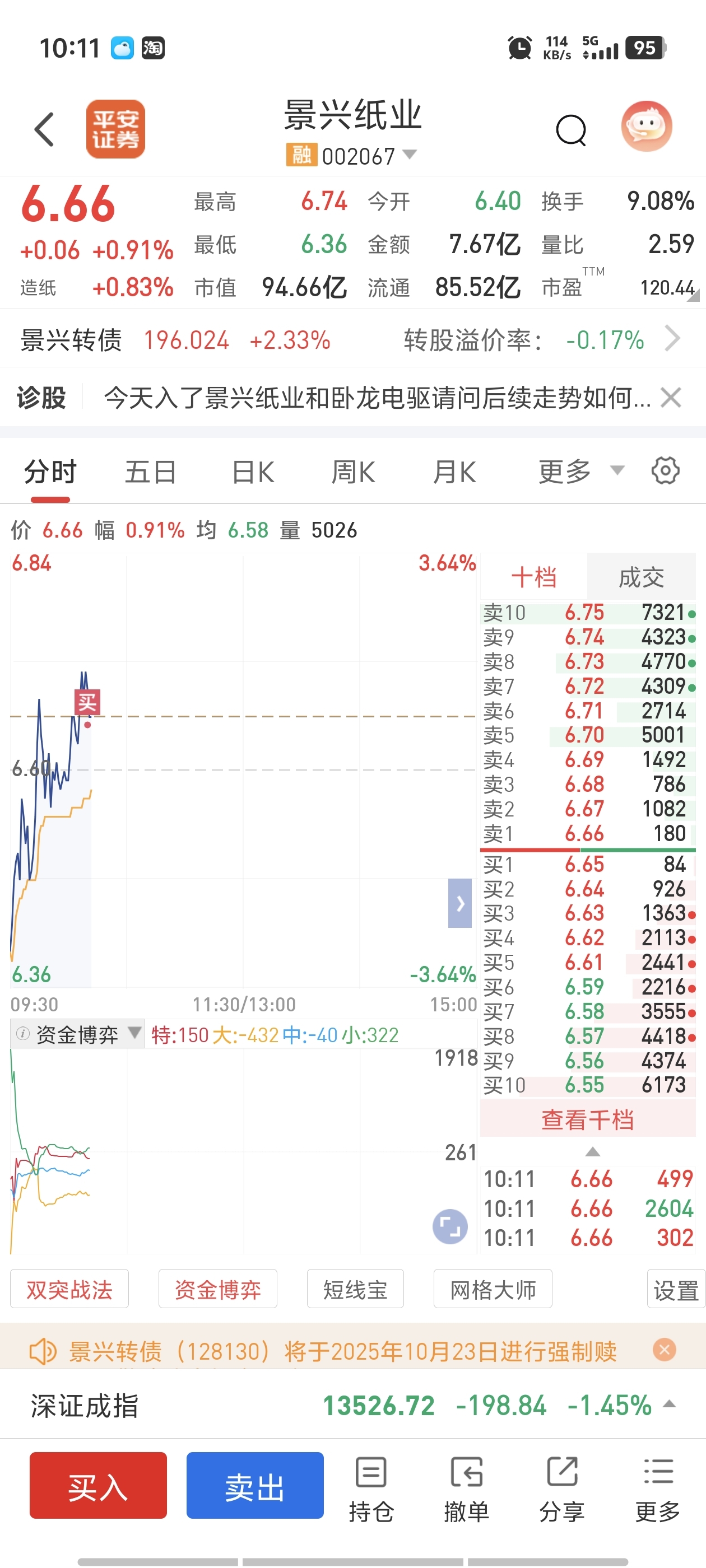 $景兴纸业(SZ002067)$ 我只是手痒!想试一下6.66的价格能不能买进!结果一下就成交了!绝对是坑!!!!!!
