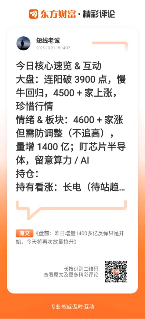 昨天的市场情绪继续增强,超过4600家上涨,大家都在狂欢,但是也要注意随时也有可能调整,因此尽量不要盲目去追高位股,昨天的量能增加超过1400亿, 说明观望的人也在开始慢慢进场,接下来的行情如果继续走强,跑步进场的只会越来越多,那么市场赚钱效应就会越来越好。今天的指数和板块我都是继续看好,板块继续看好芯片半导体,算力和人工智能也有机会,最近都没有他们的声音,接下来还是需要重点关注起来。