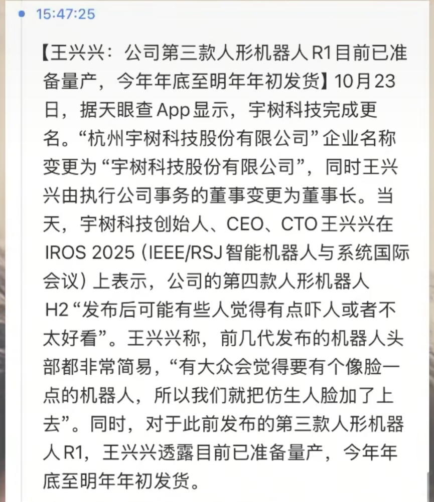 宇树第三代机器人R1正式上市,准备量产。