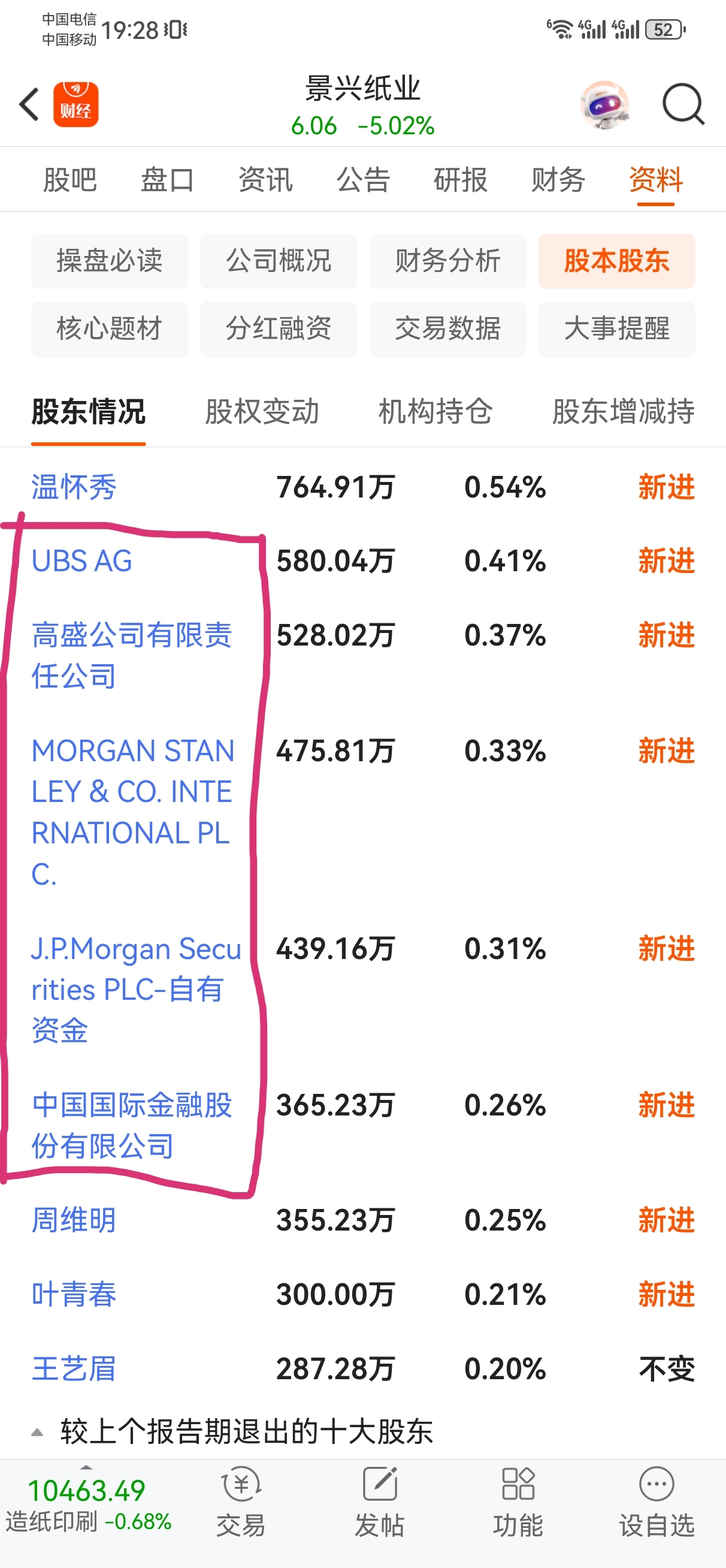 $景兴纸业(SZ002067)$ 看十大流通股东,UBSAG、高盛、大通摩根、中金都来了。国际国内大投行都来了。