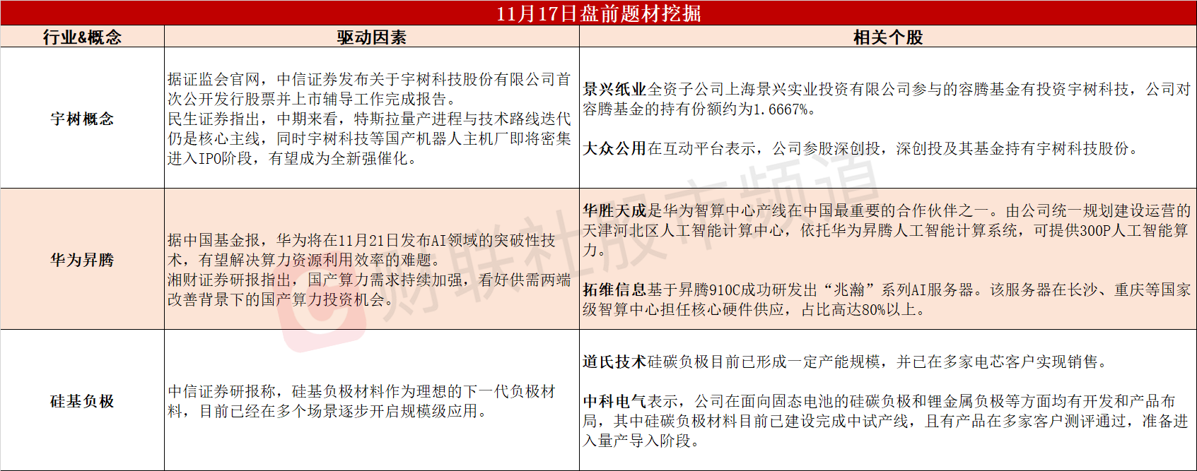 ①宇树科技IPO辅导完成,机器人板块有望迎来强催化。②华为将发布AI领域突破性技术,国产算力投资机遇凸显。③硅基负极材料开启规模级应用,产业链具备极大发展前景。