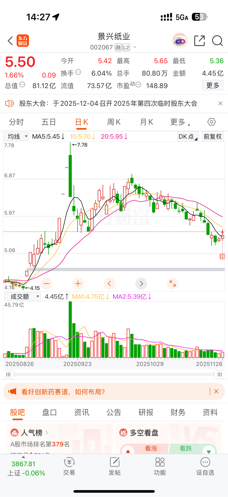 $景兴纸业(SZ002067)$ 两天之内不赚就割