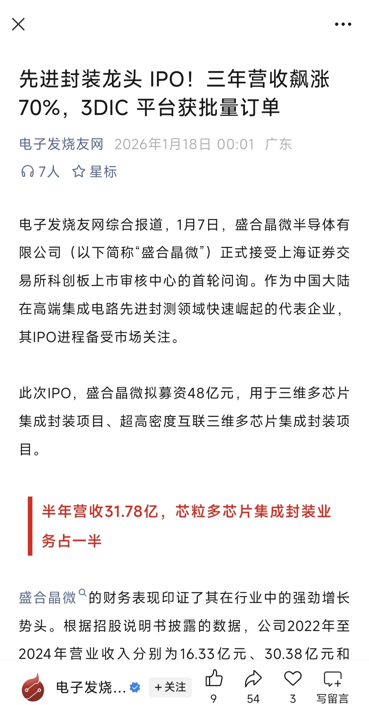 2026年1月7日,盛合晶微正式披露科创板IPO首轮审核问询函回复。@亿道信息亿