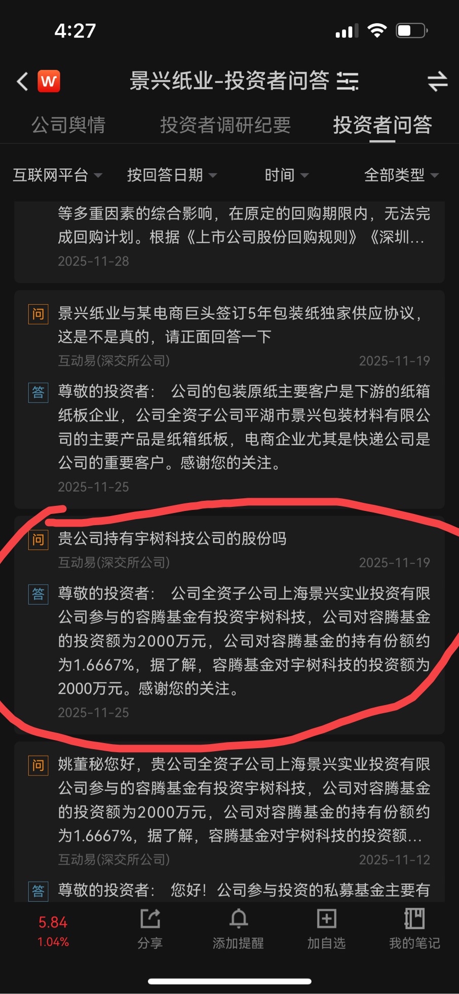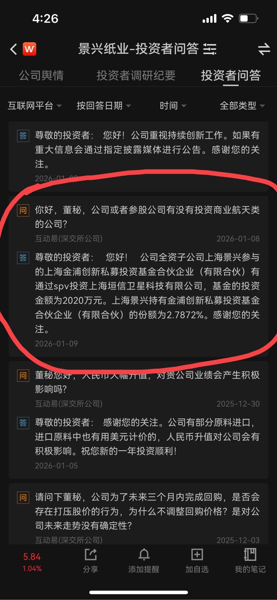 20260109互动易:公司全资子公司上海景兴参与的上海金浦创新私募投资基金合伙企业(有限合伙)有通过spv投资上海垣信卫星科技有限公司,基金的投资金额为2020万元。