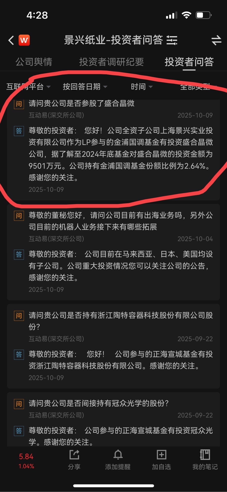 20251009互动易:公司全资子公司上海景兴实业投资有限公司作为LP参与的金浦国调基金有投资盛合晶微。据了解,该并购基金对盛合晶微的投资额为9501万元。