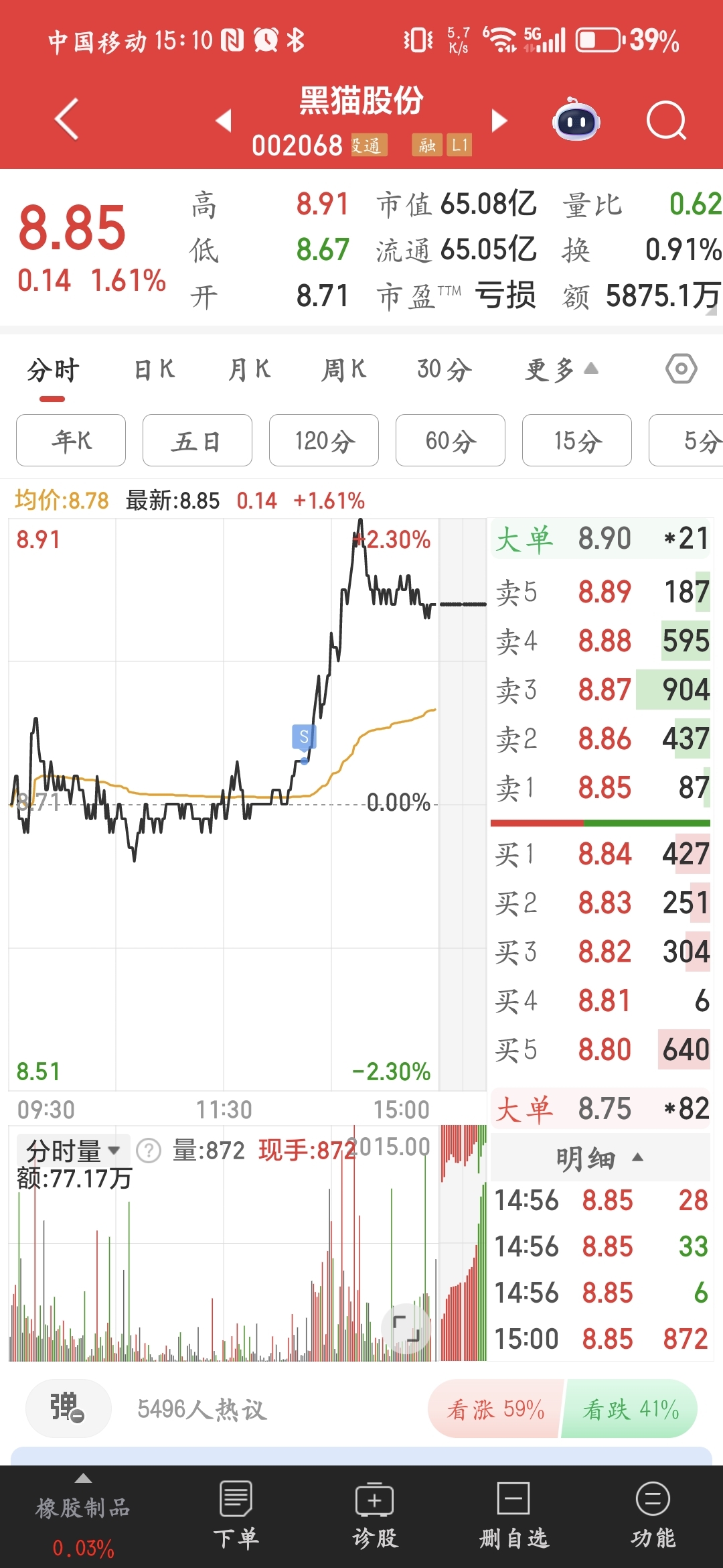 $黑猫股份(SZ002068)$ 今天居然不相信猫兄,活该亏钱