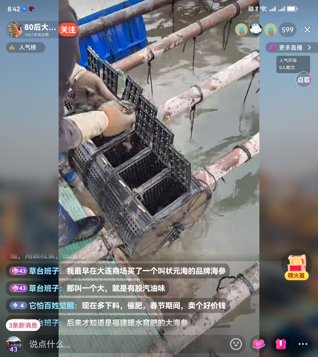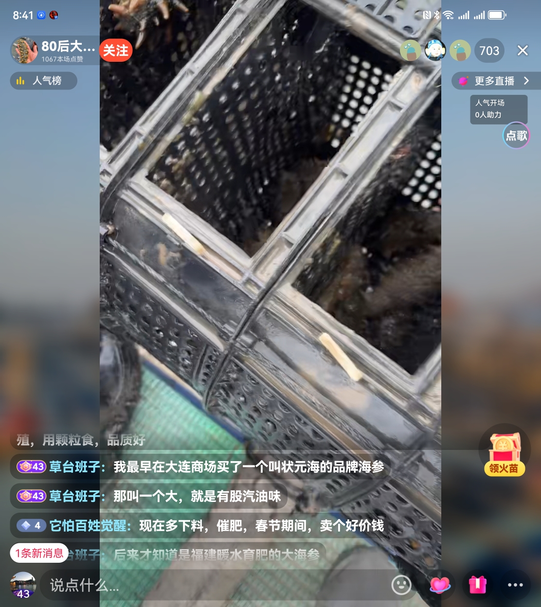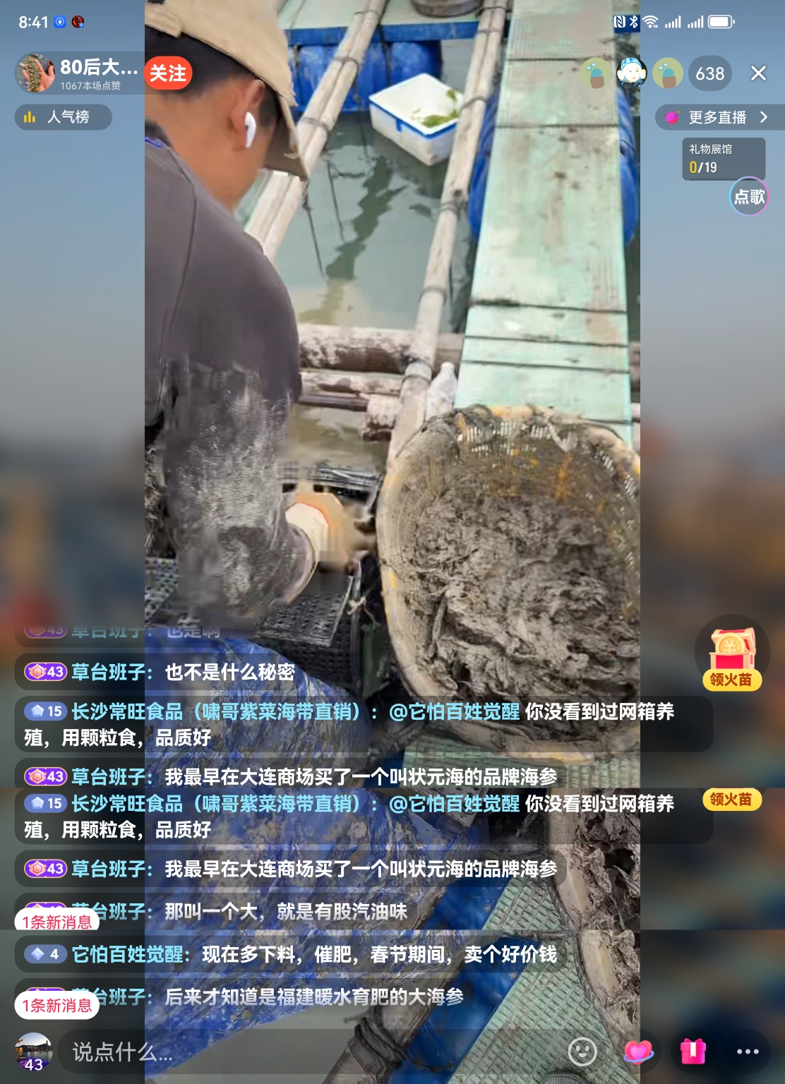 $獐子岛(SZ002069)$ 福建暖水育肥的吊龙参直播间人数很炸裂啊。不知道这种吃海带拌海泥的育肥参有几人懂,獐子岛能不能弄个在海上或海底直播间,让你全国人民看看,海参的主要营养是海底矿物质,不是靠吃海带的。
