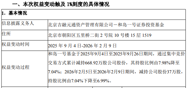 2月10日晚间,獐子岛(002069)发布公告,近日,公司收到持股5%以上股东北京吉融元通资产管理有限公司-和岛一号证券投资基金(以下简称“和岛一号基金”)发来的《关于减持獐子岛股份触及1%刻度的告知函》,和岛一号基金于2025年9月4日至2025年9月26日期间,通过集中竞价交易方式累计减持668.92万股公司股份,其持股比例由7.98%降至7.04%;2026年2月5日至2026年2月9日期间,减持公司股份37万股,减持后该股东持有4971.27万股公司股份,持股比例由7.04%下降至6.99%。