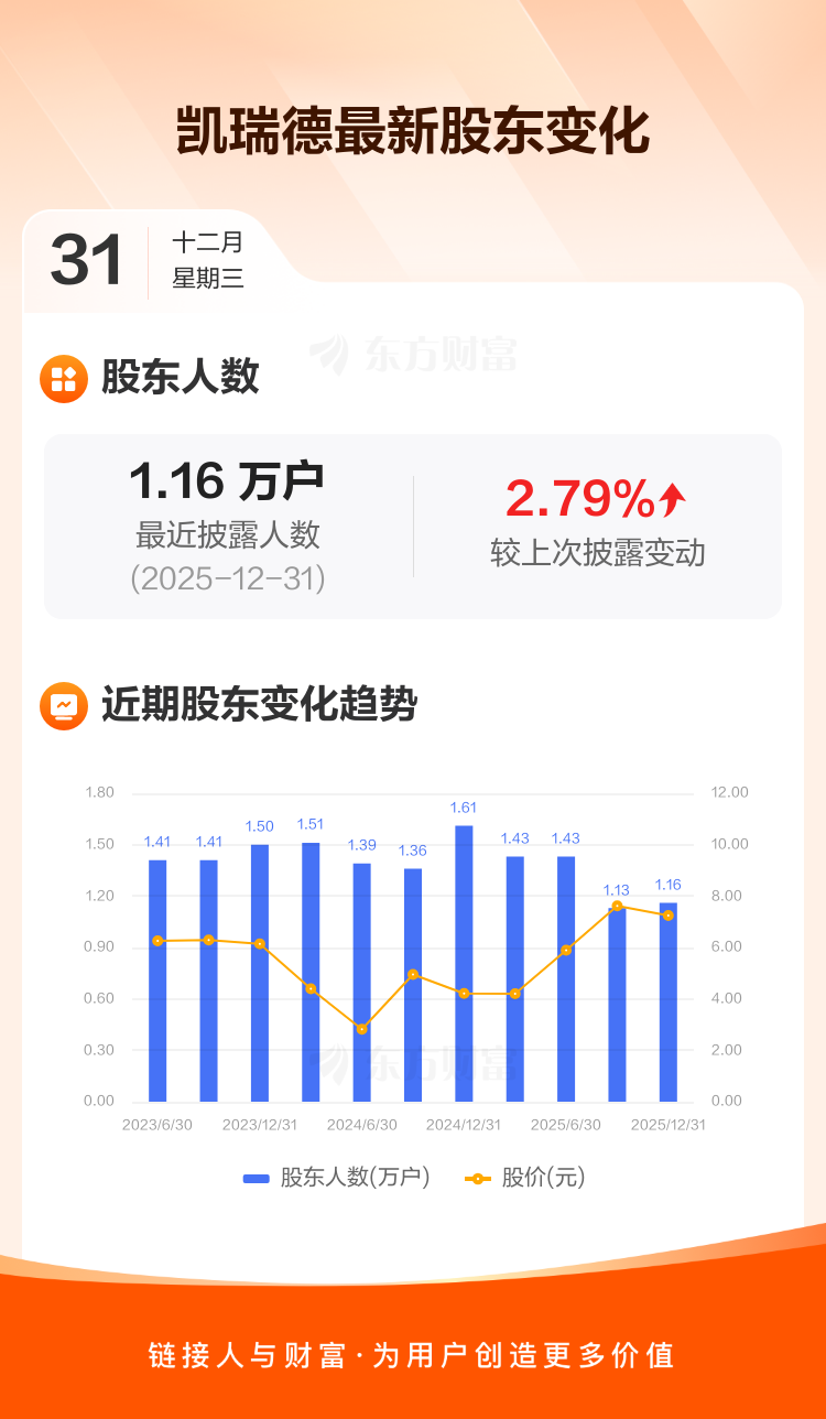 凯瑞德最新披露数据显示,截至12月31日公司股东户数为1.16万户,较上期(2025年9月30日)增加314户,增幅为2.79%。户均持有流通股数量由上期的3.26万股下降至3.17万股,户均持股金额由上期的24.84万元减少至22.96万元。