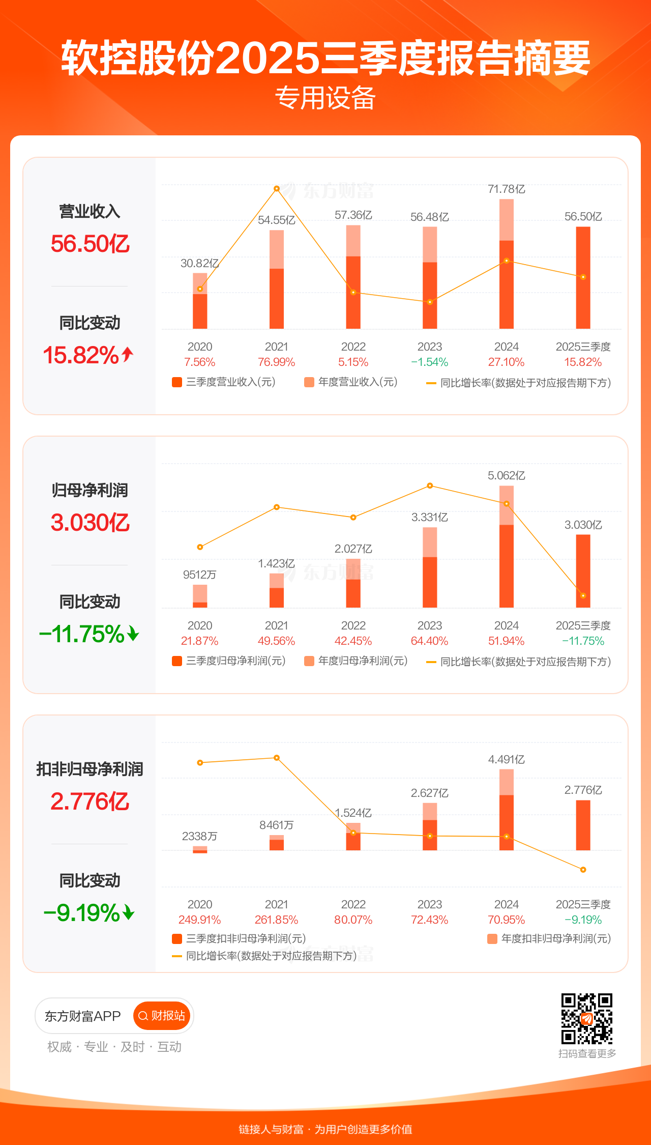 软控股份10月28日发布2025年三季报显示,公司前三季实现营业收入56.50亿元,同比增长15.82%;归母净利润3.03亿元,同比下滑11.75%;扣非归母净利润2.78亿元,同比下滑9.19%。