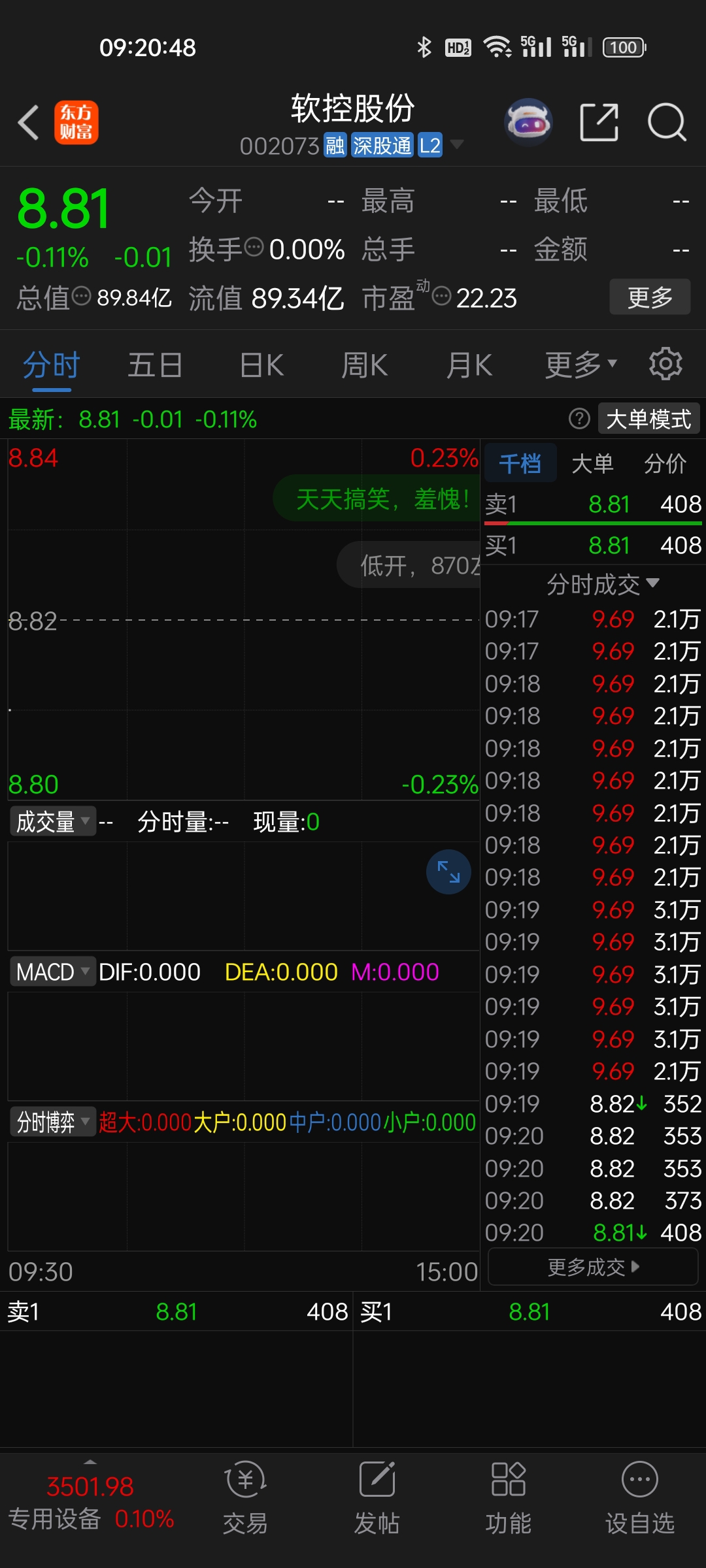 $软控股份(SZ002073)$ 8.88已经满仓,竞价3万手就涨停,卖盘不高,主力已经控盘。等待数钱
