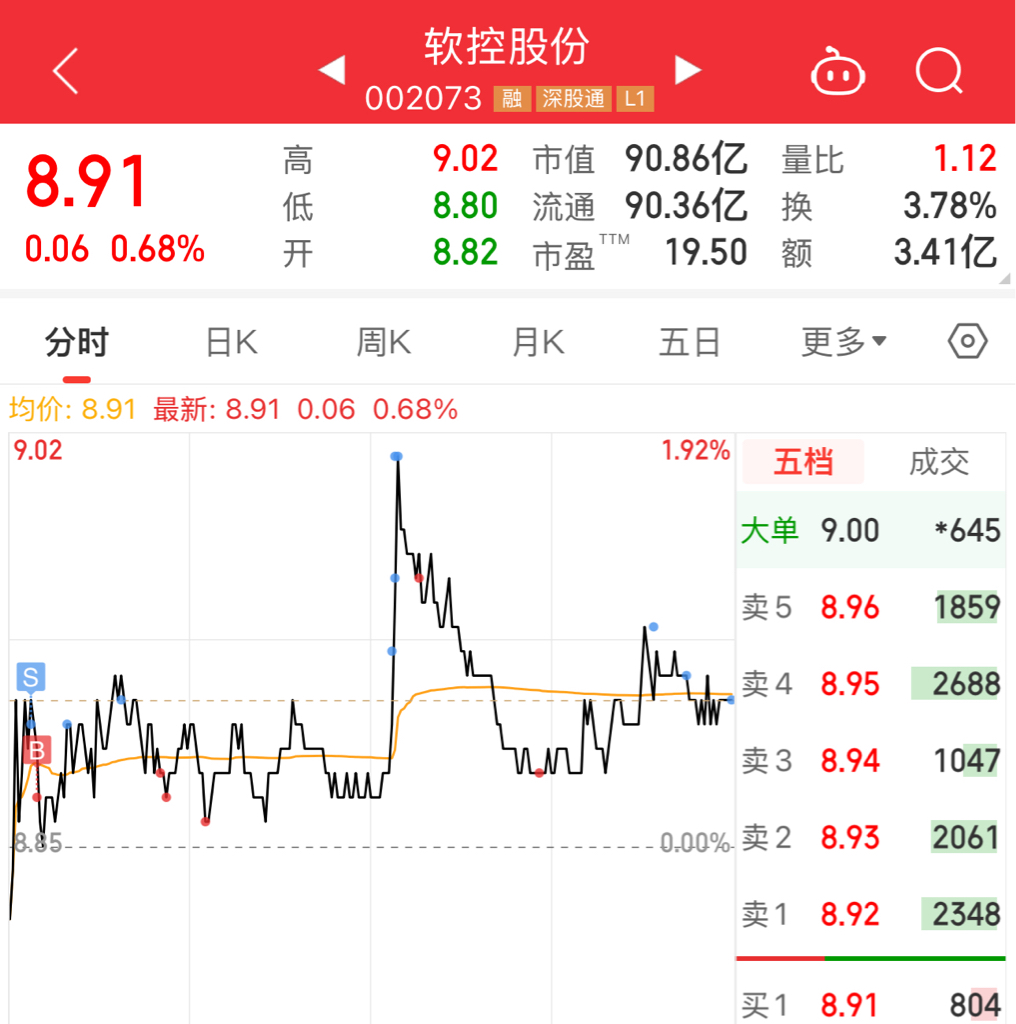$软控股份(SZ002073)$ po一下今天的买卖点,目前6成仓成本6.6,每天4成仓做t赚个几千还是很舒服的