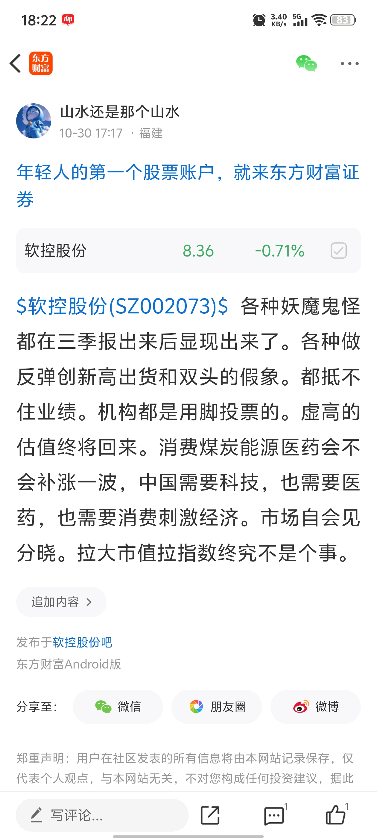 温馨提示: 1.根据《证券法》规定,禁止编造、传播虚假信息或者误导性信息,扰乱证券市场;2.用户在本社区发表的所有资料、言论等仅代表个人观点,与本网站立场无关,不对您构成任何投资建议。用户应基于自己的独立判断,自行决定证券投资并承担相应风险。《东方财富社区管理规定》