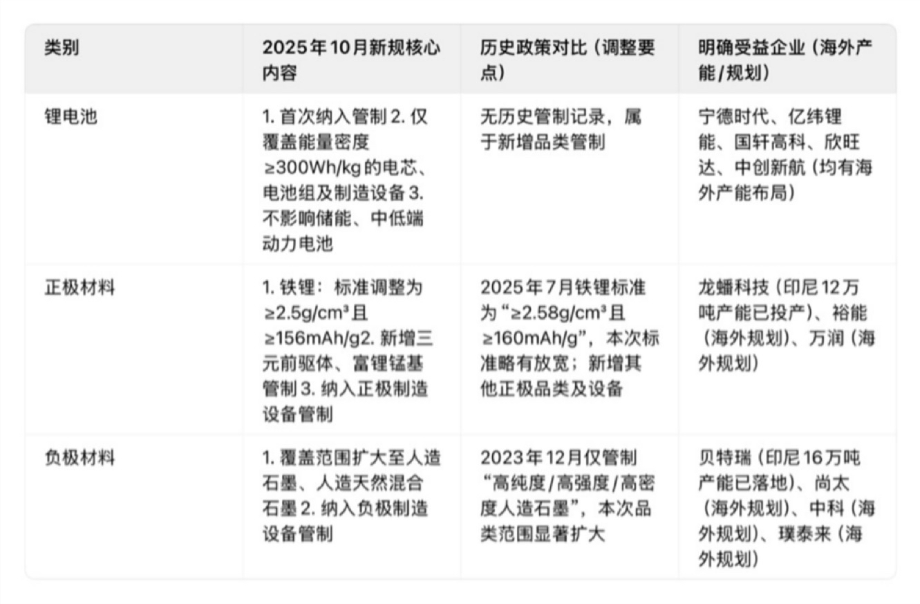 • 负极材料:相较于2023年12月仅管制高纯度/高强度/高密度人造石墨,本次将人造石墨、人造天然混合石墨及负极制造设备全面纳入,覆盖范围扩大。
