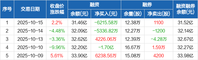 融资方面,当日融资买入2.09亿元,融资偿还2.71亿元,融资净偿还6215.58万元。融券方面,融券卖出2.5万股,融券偿还2.39万股,融券余量12.38万股,融券余额518.47万元。融资融券余额合计31.52亿元。