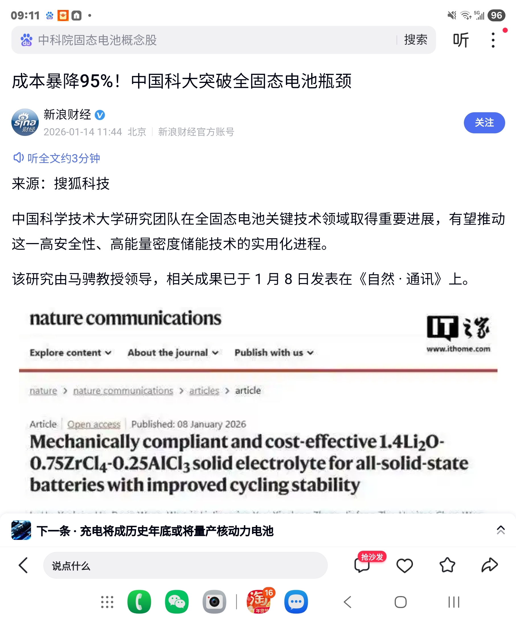 同在合肥的中科大在固态电池成本和性能上取得重大突破。