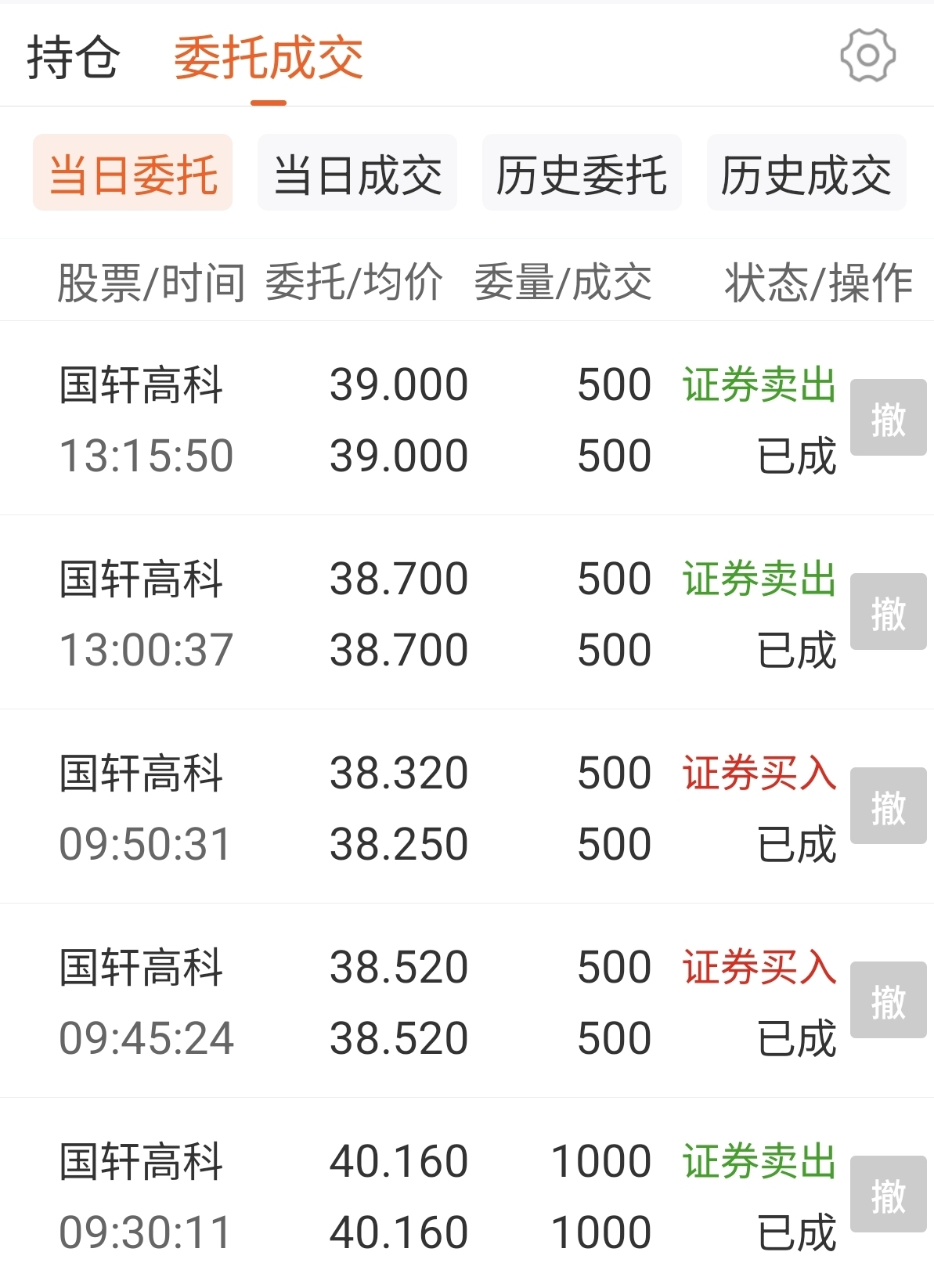 $国轩高科(SZ002074)$ 今天的T还是比较爽的,开盘看到千载难逢的机会,第一次做反T,然后低位又买了回来。然后对应38.25的那次买回38.7卖出,然后对应38.52的那次买回38.9再次卖出。今天最后两次的卖出,明天看低点伺机再买回。这几个来回降低了不少成本。