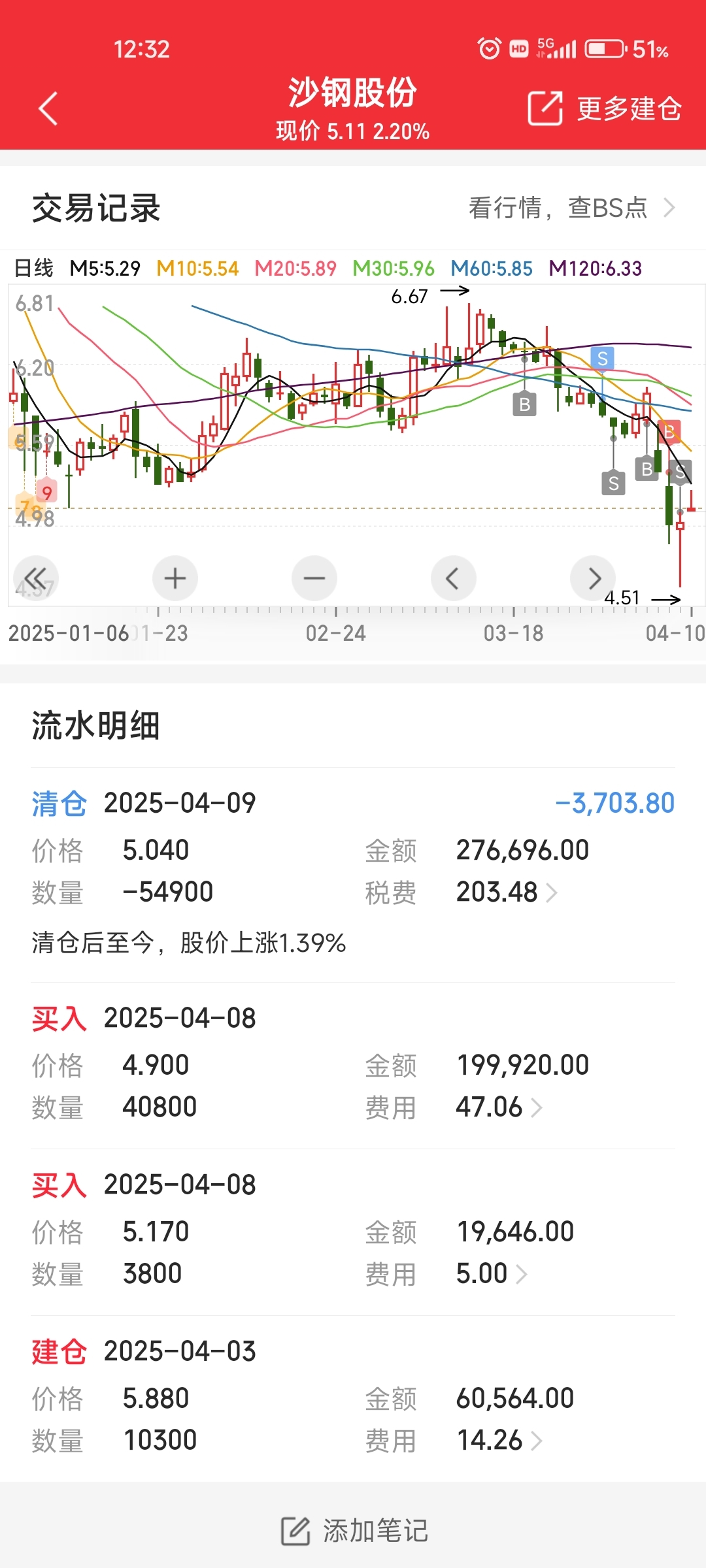 $沙钢股份(SZ002075)$ 从4万,6.34的本,一路补到5.1,最终亏3千多离场。