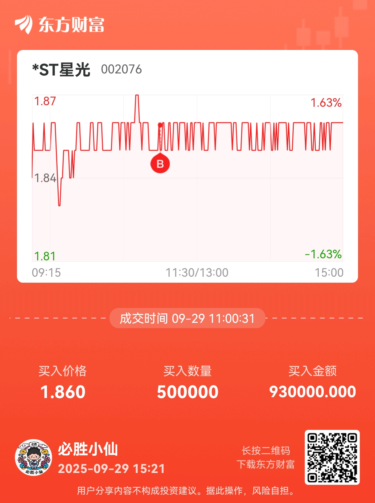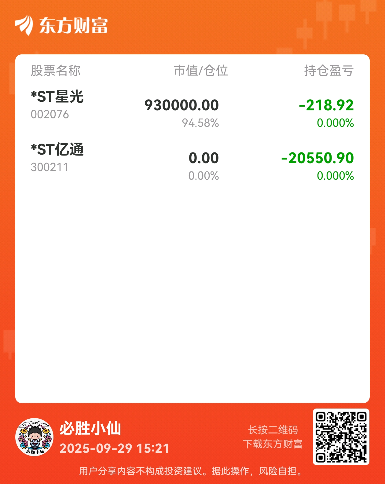$*ST星光(SZ002076)$ $*ST亿通(SZ300211)$ $ST股(BK0511)$ 亲,亿通小亏2W,止损了。总感觉哪里不对,算了,留下的发财吧!第一次一次性买入50W股,算是当日顶格交易了吧,真是很好的,很好的,很好的。