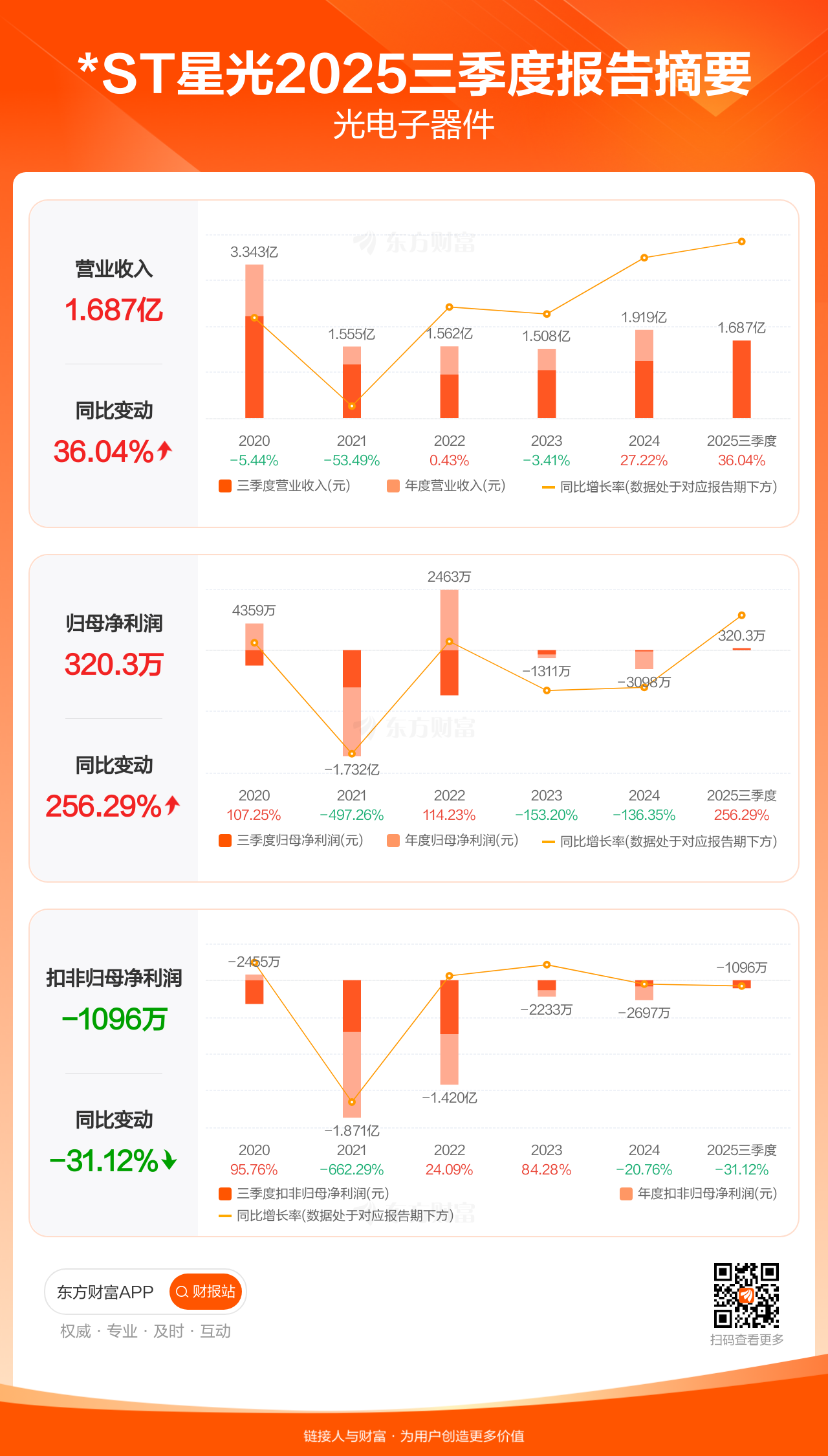*ST星光10月31日发布2025年三季报显示,公司前三季实现营业收入1.69亿元,同比增长36.04%;归母净利润320.25万元,同比增长256.29%;扣非归母净利润-1096.04万元。