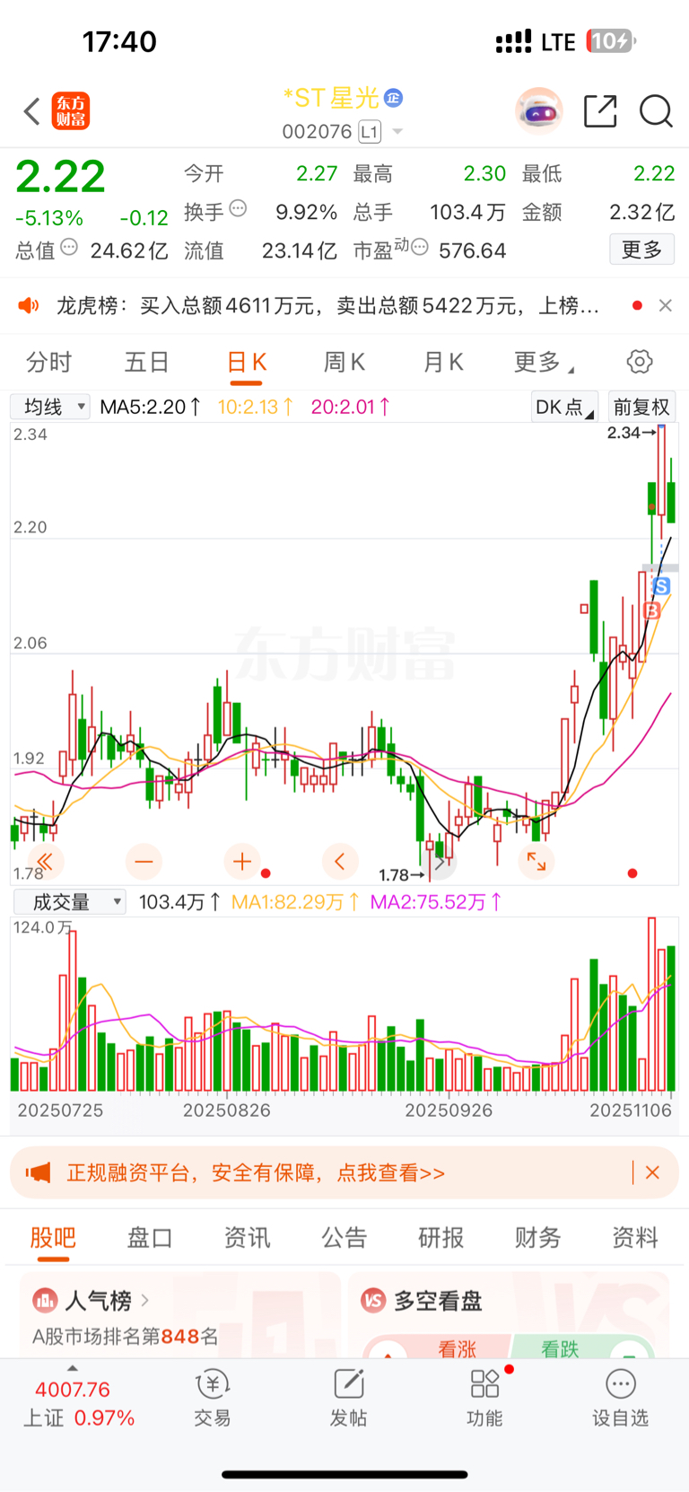 $*ST星光(SZ002076)$ 昨天把它卖了买的欣龙控股,明天吃大肉